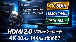 hdmi2.0 リフレッシュレートは何Hzまで出せるのかを、4K・1440p・1080p別にわかりやすく解説。144Hzが出ない原因、確認手順、HDMI 1.4・2.1との違いまで整理します。