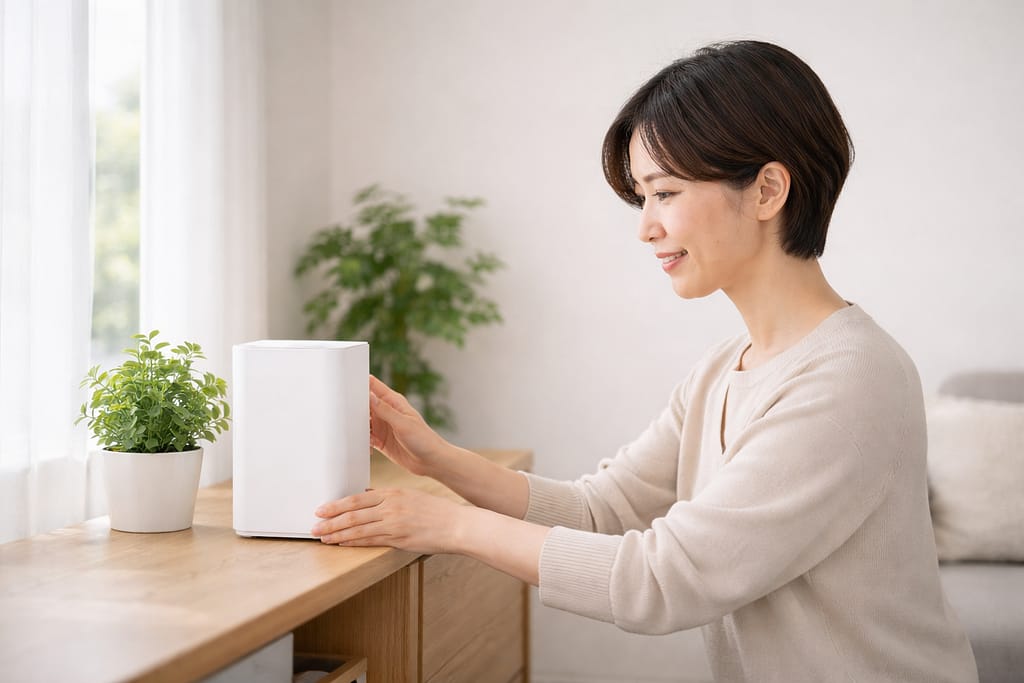 窓に寄せすぎてWi-Fiが廊下や寝室に届かないなら、窓際から1〜2m内側へ移すとバランスが取れます。リビングに置く場合は、人の動きが多いので床置きは避け、棚の上で周囲をすっきりさせましょう。
